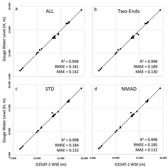 ICESAT-2-derived mean WSE vs. gauge observed mean water level at 37 VSs from the four methods: (a) ALL, (b) Two-Ends, (c) STD and (d) NMAD. The units for both RMSE and MAE are metres.