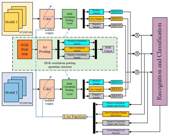 For multimodal image pairs, the framework has two separate feature extraction networks. To reduce the dimensionality of features, following the feature extraction backbone, a 1 × 1 convolution layer is used, and the modal 1 feature map and modal 2 feature map are obtained separately. Then, a special HGR maximal correlation pooling layer is employed. The HGR pooling handles multimodal pairs (vectors) and only intervenes in the information transmission without changing the value of the transmitted information. The principle is to filter the values of information with different relevant characteristics and transmit them to the corresponding subsequent classification channels. The feature data are processed to obtain positive sample data, zero sample data, and negative sample data for modal 1 and modal 2 features, respectively. Then, the three types of sample data from modal 1 and modal 2 are input into the ResNet50 [] network to extract feature vectors, and feature level fusion is performed on the corresponding feature vectors to obtain fused positive samples, fused zero samples, and fused negative samples.