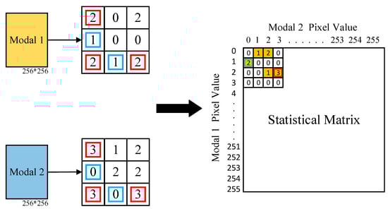 The input set of multimodal images needs to be pre-aligned to generate heatmaps. denotes the input data of modal 1 pixel matrix of size , and denotes the input data of modal 2 pixel matrix of size . The statistical matrices of modal 1 and modal 2 images are illustrated by empirical distributions and defined as follows: