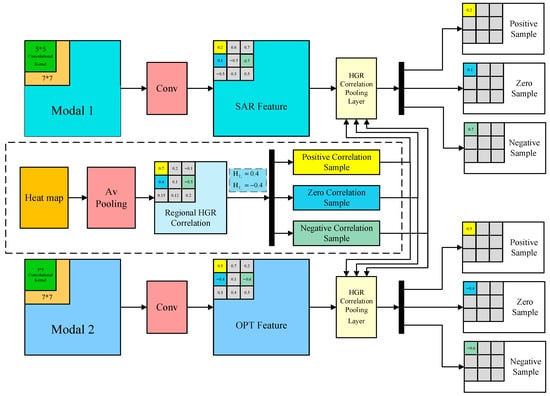 As shown in Figure 6, the corresponding modal 1/modal 2 features are transmitted through the special HGR pooling layer, which intervenes in the information transmission based on the HGR maximum correlation matrix instead of normal pooling methods without changing the value of the transmitted information. Meanwhile, the modal 1/modal 2 feature maps are divided into positive samples, zero samples, and negative samples for modal 1 and modal 2 data, respectively.