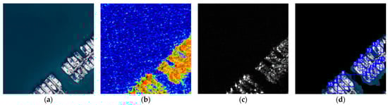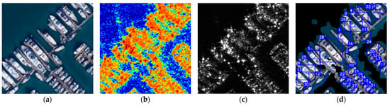 Ship recognition experiment 2: (a) optical image; (b) heatmap; (c) SAR image; (d) ship recognition results.