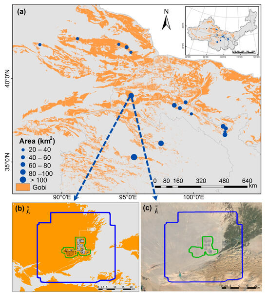 Study area. (a) Location of the Gobi region and photovoltaic power plants in China; (b) Dunhuang PV power plant; (c) Google Earth satellite imagery of Dunhuang PV power plant. The green line and blue line in (b,c) indicate in (1 km buffer) and out (15 km buffer) of the Dunhuang plant.