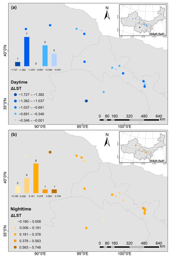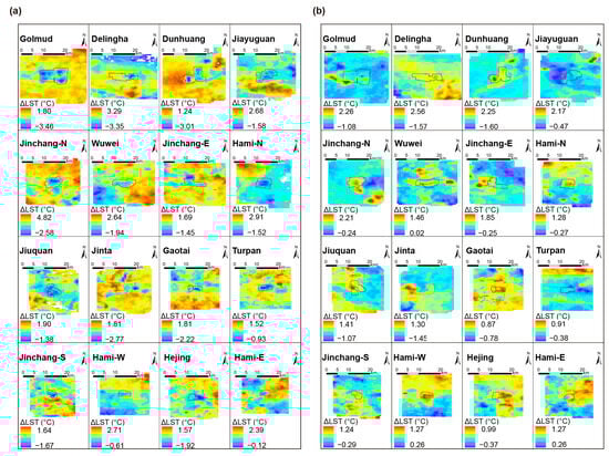 Effects of photovoltaic power plant on LST of (a) daytime period and (b) nighttime period.