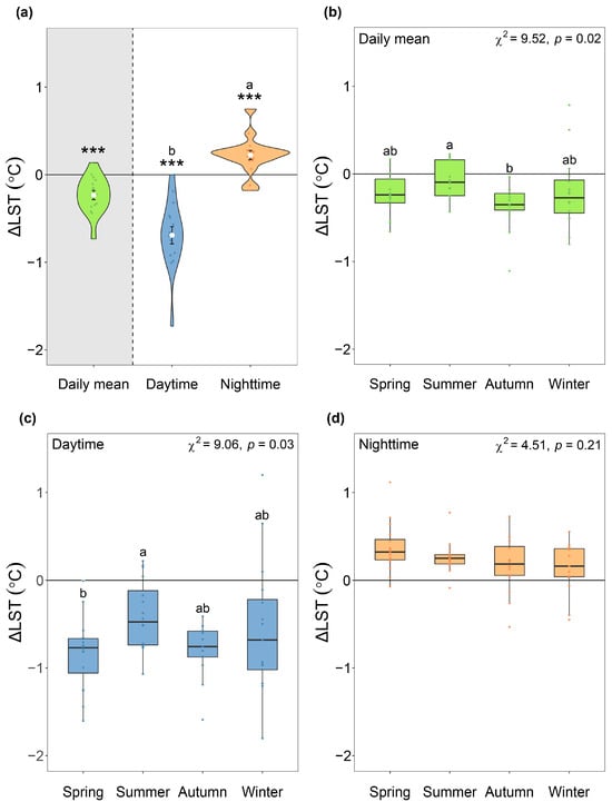 Effect of photovoltaic power plants on LST across all plants. (a) Diurnal variations in effects (ΔLST); the background violin plot characterizes the distribution of plants in each diurnal period effect, while white dots represent the mean value. Statistical difference was tested by one-sample t-test between each period effect and zero (μ = 0) and independent two-sample t-test between daytime and nighttime period. ***: statistically significant at p < 0.001 levels, respectively. Seasonal variation in effects (ΔLST) separated into (b) daily mean, (c) daytime period, and (d) nighttime period. Statistical difference was tested by Kruskal–Wallis analysis and Dunn’s test as a post hoc analysis to investigate pairwise differences between seasons. The boxes represent the interquartile range, the lines inside the boxes represent the medians, and the whiskers denote the lowest and highest values within 1.5 times the interquartile range. Lowercase letters denote significant differences between seasons. Colored dots represent each plant data.