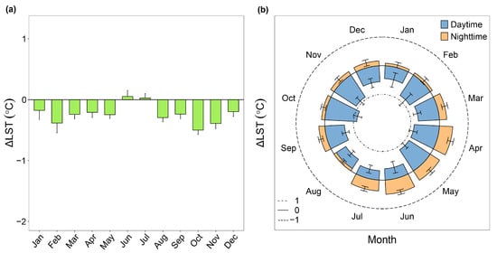 We explored the effects of PV power plants on monthly LST (Figure 6). We found that the daily mean LST changes cooled (ΔLST < 0) for all months except for June and July, which exhibited a slight warming effect (ΔLST > 0) (Figure 6a). The extent of cooling varied across the year, ranging from the least in January to the most in October. During the daytime, the highest cooling effect (ΔLST < 0) was observed in October. Conversely, during the nighttime, the highest warming effect (ΔLST > 0) was during June.
