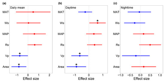 Factors that influenced the effects of PV power plant on LST, include area, mean annual temperature (MAT), mean annual precipitation (MAP), solar radiation (Rs), wind speed (Ws), and water vapor pressure (Vp). Estimate effect sizes with 95% confidence intervals are derived from the weighted average standardized coefficients of models with ΔAICc < 4. The relative importance of factors on (a) daily mean, (b) daytime period, and (c) nighttime period, as estimated by linear models. Blue lines indicate negative effects, and red lines indicate positive effects. *: statistically significant at p < 0.05 level. Model-averaged importance of the predictors and the p-value of each factor are shown in Figure 8 and Table S3.