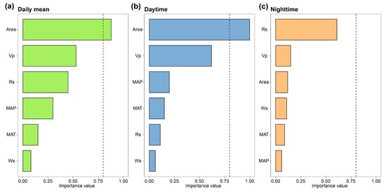 Importance of each predictor of the PV power plant effects, (a) daily mean, (b) daytime period, and (c) nighttime period. The importance value is based on the sum of Akaike weights derived from model selection using corrected Akaike’s information criteria. Cutoff is set at 0.8 (dash line) to differentiate between essential and nonessential predictors.