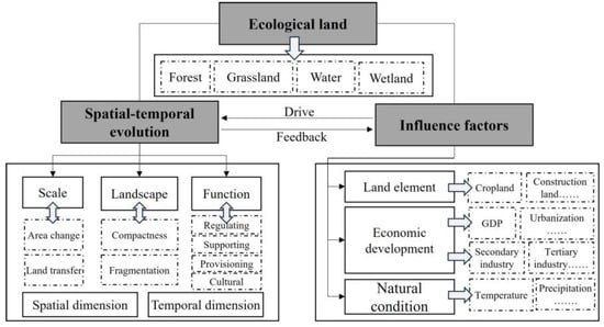 This study defines EL from the perspective of its core function. Land is an integrated functional system with production, living, and ecological functions. EL plays a predominantly natural ecological function, including forest land, grassland, water, and wetland. The exclusion of cropland and unused land is justified for the following reasons: Firstly, since the beginning of the 21st century, China has experienced a significant increase in population, leading to an elevated strategic position of food security. Cropland increasingly emphasizes its role in ensuring national food security by emphasizing its social security attributes. Therefore, cropland mainly serves the function of food production and should not be included in the category of EL. Additionally, the long-term application of fertilizers and pesticides, as well as land fragmentation issues, have negative impacts on the ecological environment [6]. Therefore, this study excludes cropland from EL. Secondly, compared to wetland, other unused lands such as desert and barren land have relatively lower ecosystem service functions [27,28]. Hence, they should be excluded from EL.