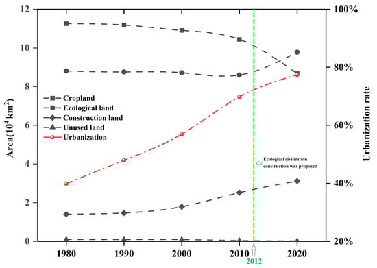 From Figure 3, it can be observed that the area of EL in the BTH region was consistently decreasing before 2010, with a particularly significant loss between 2000 and 2010. During this period, the level of urbanization in the BTH region was also in a stage of rapid development, especially in Beijing and Tianjin, where the pace of urbanization far exceeded that of the periods from 1990 to 2000 and from 2010 to 2020. The expansion of construction land driven by urbanization demands led to a significant encroachment and loss of EL. Additionally, as important destinations for population influx, the sharp increase in the number of migrants to Beijing generated substantial pressure on the protection of EL due to the resulting housing demand. However, since around 2010, there has been an increasing trend, reaching approximately 100,000 km2 by 2020. In 2012, China proposed the strategy of Ecological Civilization Construction, which strengthened the management and restoration of EL, leading to significant protection achievements [54]. In contrast, unused land and cropland have been continuously decreasing, with cropland experiencing significant losses since the beginning of the 21st century. The expansion of construction land has been synchronous with the development of urbanization in China. In the early 21st century, the rapid development of urbanization led to a substantial expansion of construction land, encroaching on cropland and EL. Subsequently, the concept of “new-type urbanization” was proposed, advocating for intensive and low-carbon urbanization, which then limited the disorderly expansion of construction land.