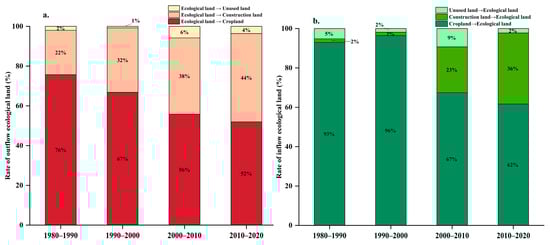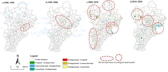 Spatial distribution of ecological land transfer: (a) Spatial characteristics of ecological land transfers, 1980–1990; (b) Spatial characteristics of ecological land transfers, 1990–2000; (c) Spatial characteristics of ecological land transfers, 2000–2010; (d) Spatial characteristics of ecological land transfers, 2010–2020.