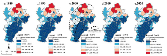 Spatial distribution of ecological land: (a) Spatial distribution of ecological land, 1980; (b) Spatial distribution of ecological land, 1990; (c) Spatial distribution of ecological land, 2000; (d) Spatial distribution of ecological land, 2010; (e) Spatial distribution of ecological land, 2020.