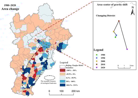 Overall, during the period from 1980 to 2020, most counties were facing the risk of EL reduction, with the threats and instability in the southeastern part of the area further intensifying (Figure 7). Firstly, the counties experiencing area loss were mainly concentrated in the Bashang Plateau region and along the Taihang Mountain, with the area centroid showing a tendency to shift towards the southeast. Although the reduction in EL area in these two areas was less than 50%, as high-value areas in the regional distribution of EL, the changes in their area undoubtedly had a significant impact on the health and stability of the regional ecosystem. Therefore, necessary measures should be taken to prevent a further loss of EL area in this region. Secondly, areas with significant fluctuations in EL area were mainly located in the North China Plain region. On the one hand, due to its flat terrain, human activities have a more pronounced impact on EL, leading to fluctuations in the EL area. On the other hand, the area of EL in the North China Plain region was much lower than that in the Bashang Plateau and Taihang Mountains, making it more susceptible to spatial fluctuations in EL area.