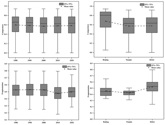 In terms of the landscape dimension, the compactness of EL exhibited a certain level of temporal stability, while the fragmentation showed dynamic fluctuations after entering the 21st century (Figure 8). Firstly, the compactness of EL remained around 0.6 across all time periods, with Beijing’s EL compactness being slightly higher at 0.69 compared to Tianjin and the Hebei province. Secondly, before the year 2000, the fragmentation of EL in the region showed a relatively stable trend similar to compactness. However, after entering the 21st century, the fragmentation of EL exhibited a pattern of “initial decrease-followed by increase”.