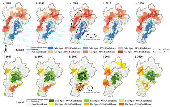 Distribution of cold and hot spots in the ecological land landscape. (a–e) Distribution of fragmentation hot and cold spots in the ecological land; (f–j) Distribution of compactness hot and cold spots in the ecological land. Figure (a–e) show the fragmentation cold–hot spots, and (f–j) show the compactness cold–hot spots.