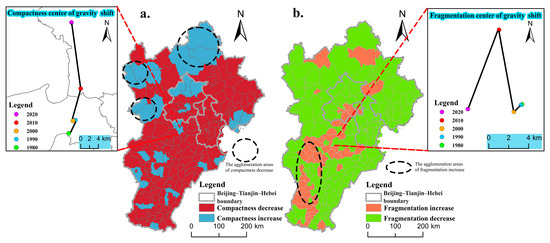 Spatial distribution and gravity center shift of the ecological land landscape, 1980–2020: (a) Distribution of compactness and gravity shift in the ecological land, 1980–2020; (b) Distribution of fragmentation and gravity shift in the ecological land 1980–2020.