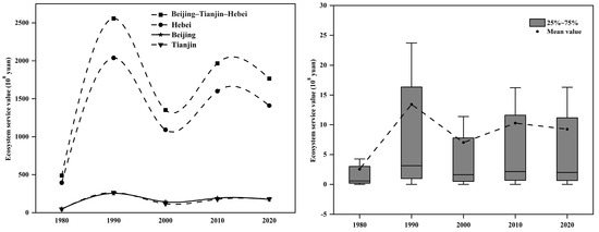 From the perspective of the function dimension, whether at the provincial or county level, the ecosystem service value exhibited a dynamic “M”-shaped trend, with peaks in 1990 and 2010. The fluctuations before 2000 were more pronounced (Figure 11). The trend of the ecosystem service value in the Hebei province was higher than that of Beijing and Tianjin, occupying an overwhelmingly dominant position. It is evident that the fluctuation in the ecosystem service value in the Hebei province played a crucial role in maintaining the balance of the regional ecosystem, directly influencing the overall trend of value change. In contrast, Beijing and Tianjin, as directly administered municipalities in China, faced limitations in urban functional positioning and the urban scale, making it difficult to reserve sufficient space for the restoration and expansion of EL. Therefore, the ecosystem service value in these cities remained at a relatively low level, with minimal fluctuations.