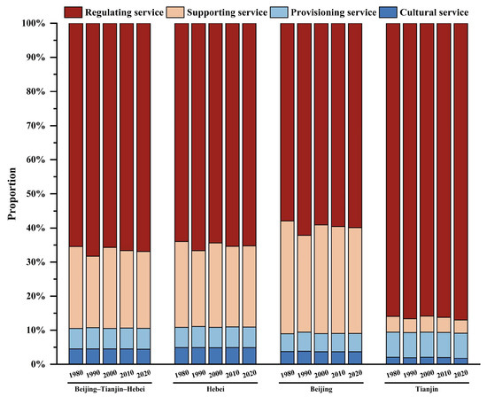 Furthermore, among the various ecosystem service functions, there were significant differences in the ecosystem service values of different functions (Figure 12). The regulating function consistently occupied a dominant position in the BTH region, with its proportion exceeding 60% at all time points, particularly close to 90% in Tianjin. Additionally, the supporting function also accounted for a certain proportion, with proportions exceeding 20% in all regions except for Tianjin. In contrast, the proportion of the cultural service function in the BTH region remained relatively low at all time points, consistently below 6%, much lower than the other three service functions. With the steady development of the socio-economy and increasing living standards, there is an urgent need to satisfy the public’s demand for cultural and recreational activities. EL, as a place for leisure, recreation, and social interaction, plays an important role in enhancing public well-being and life satisfaction [20,55]. Clearly, there is still a gap in the cultural service function in the ecosystem service of the BTH region. Therefore, in future EL protection and management processes, it is necessary to strengthen the cultural service function.