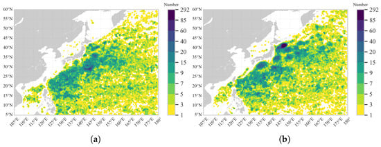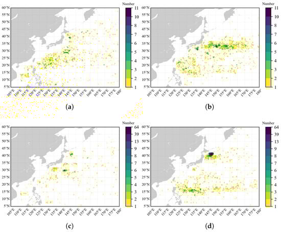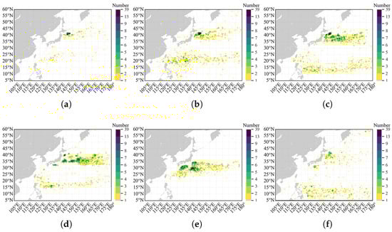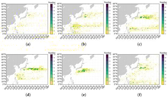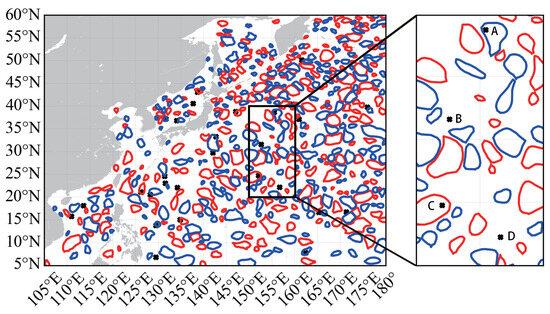 - Itoh, S.; Yasuda, I. Characteristics of mesoscale eddies in the Kuroshio-Oyashio extension region detected from the distribution of the sea surface height anomaly. J. Phys. Oceanogr. 2010, 40, 1018–1034. [Google Scholar] [CrossRef]