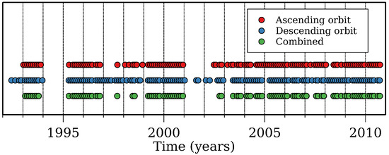 Displacement data dates (reprinted from [33]). The acquisition dates of the ascending- and descending-orbit images are represented by red and blue circles, respectively. The green circles indicate the dates of the computed horizontal () and quasi-vertical () displacements.