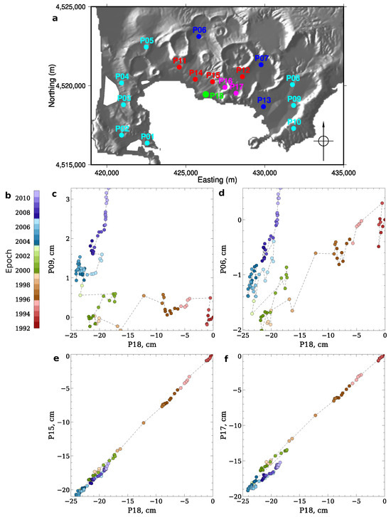 Scatter plots of the quasi-vertical displacement at selected locations in Campi Flegrei (P09, P06, P15, P17) and in the area of maximum pre-2000 subsidence (P18) from 1993 to 2010. Each location is circular, with a diameter of 600 m. The map in (a) displays all the sampled locations. The map uses a colour scheme to represent locations characterised by similar scatter plots. Cyan indicates locations with noisy almost-zero displacements during Campi Flegrei subsidence and uplift after then; an example is shown in (c). Blue indicates locations with a positive correlation with P18 during Campi Flegrei subsidence and uplift after then; an example is shown in (d). Red indicates locations with a positive correlation with P18 during the whole 1993–2010 period; an example is shown in (e). Magenta indicates locations with a positive correlation with P18 during the whole 1993–2010 period, with some peculiarities; an example is shown in (f). The epoch is identified by the colour of the symbols in each scatter plot, which can be seen in (b). The scatter plots for all the sampled locations are shown in the Supplementary Information Figures S3–S19.