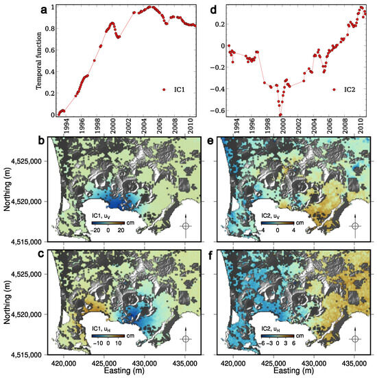 Campi Flegrei area: temporal functions and spatial distributions of the first two ICs. Each temporal function starts at zero, and the value corresponding to the maximum of its modulus is non-negative. The full range of variation, i.e., the difference between the maximum and minimum of the temporal function, is 1. The spatial distributions are presented in centimetres of displacement during the period when the related temporal function underwent its maximum variation. IC1 experienced this from the beginning of 1993 to the beginning of 2005, while IC2 experienced it from the end of 1999 to 2010. (a,d) Temporal functions of IC1 and IC2, respectively. (b,c) Spatial distributions of IC1, showing and , respectively. (e,f) Spatial distributions of IC2, showing and , respectively. Grey tones in (b,c,e,f) indicate topography (see Figure 1).
