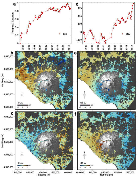 Once again, the ARD criterion suggests keeping two ICs. The temporal function of IC1 indicates a decrease in ground displacement speed, which is almost exponential (Figure 7a). A westward horizontal displacement from Vesuvio and an eastward displacement towards Vesuvio can be observed in the spatial distribution of for IC1 (Figure 7c). This finding is in line with the average horizontal velocity in the Vesuvio area reported in [33] for the period 1993–2000. The spatial distribution of for IC1 suggests subsidence in the east and uplift in the west; its interpretation is not straightforward (Figure 7b). The temporal function of IC2 is more erratic but appears to increase steadily after 2001 (Figure 7d). The distributions of IC2 indicate subsidence (Figure 7e,f), which is consistent with the mean velocities over the period 2002–2010 [33].