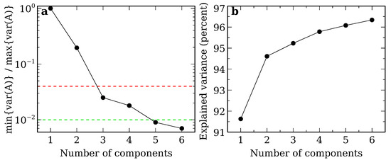 Whole area including Campi Flegrei and Vesuvio: selection of the number of components through automatic relevance determination (ARD). (a) Ratio of minimum-to-maximum posterior mixing matrix variances in relation to the number of components. The ARD criterion suggests retaining either two or four components. The red dashed line indicates the value of used by [50] as a threshold to determine the number of components to retain (two in this case). This is an arbitrary threshold, and a different choice (e.g., , green dashed line) would lead to the selection of a different number of components (four in this case). The addition of IC3 and IC4 does not affect the interpretation of the first two ICs. (b) Explained variance of the dataset in relation to the number of components.