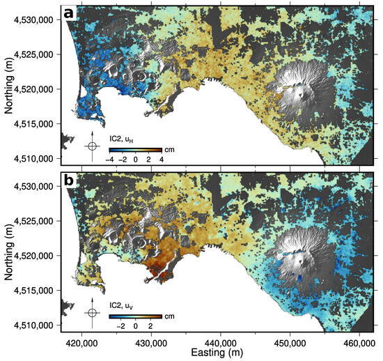 The spatial distributions of IC1 and IC2 (Figure 10 and Figure 11) are consistent with those obtained by analysing the Campi Flegrei and Vesuvio areas separately (Figure 6 and Figure 7). In the Vesuvio area, for IC1 (Figure 10b) is very small except within the rim of the Mt. Somma caldera (Figure 1). The spatial distribution of for IC2 (Figure 11a) provides an overview of the entire area. It reveals a westward displacement in the area west of Campi Flegrei, an eastward displacement between Campi Flegrei and Vesuvio, and a westward displacement in the area east of Vesuvio. The spatial distribution of indicates subsidence at Vesuvio and uplift at Campi Flegrei, which are mostly concentrated in the eastern part of the caldera. These observations are consistent with expansion occurring below Campi Flegrei and contraction occurring below Vesuvio.