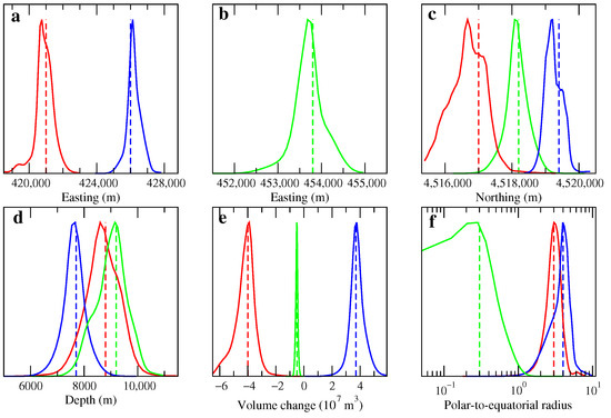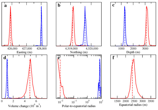 Marginal probability density functions (MPDFs) of the parameters of the two pressurised spheroidal sources that satisfy IC1 at Campi Flegrei. MPDFs were estimated using NAB and scaled to a maximum of 1 to facilitate plot interpretation. The red curves pertain to the source responsible for large-scale deformation (S1), while the blue curves relate to the source responsible for Solfatara local deformation (S2). The dashed lines relate to the parameter values listed in Table 2. (a) Easting position of the source centres. (b) Northing position of the source centres. (c) Depth to the source centres. (d) Volume change of the sources. (e) Polar-to-equatorial radius (i.e., aspect ratio) of the sources. (f) Equatorial radius of S1.
