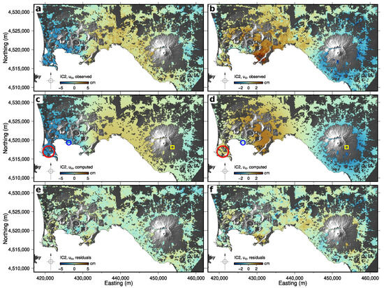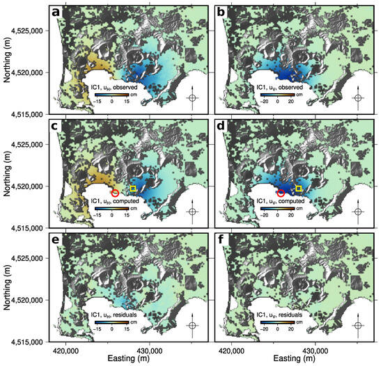 Modelling of the spatial distribution of the first independent component within the red rectangle in Figure 1. The spatial distributions are given in centimetres of displacement from the beginning of 1993 to the beginning of 2005, which corresponds to when the related temporal function underwent its maximum variation. (a,b) Horizontal and quasi-vertical displacements, redrawn from Figure 10a,b for clarity. (c,d) Computed cumulative contribution of the sill-shaped expansive source near Rione Terra and the expansive source below Solfatara. The centre of the former is marked by a red circle, while the latter is marked by a yellow square. (e,f) Residuals of the model, i.e., the differences between the spatial distribution of the first independent component and the computed cumulative contribution of the two sources.