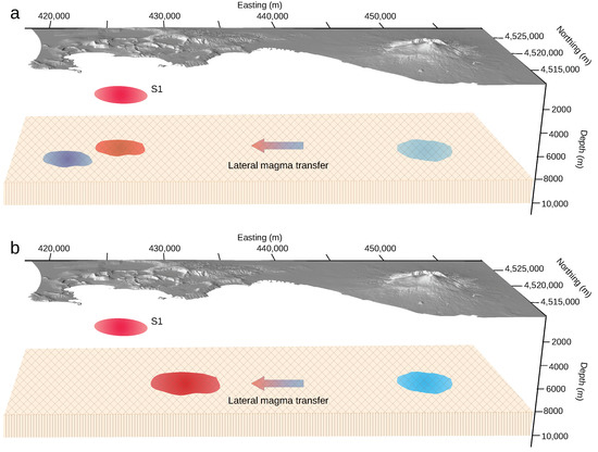 Vesuvio’s eruptions in the last 2000 years were fed by a magma reservoir approximately 4 km deep (e.g., [28,29]), although there is currently no evidence of stored melt [30]. A large sill-like magma chamber is located at approximately 8 km depth [31,32]. Between 2002 and 2010, ground velocity maps indicate contraction at 7–8 km depth [33]. Seismic activity at depths greater than about 2 km significantly decreased around 2002 (e.g., [34]).