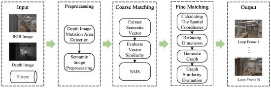 Figure 1 shows the framework of the loop detection algorithm proposed in this paper. The framework consists of three-stage pipeline modules: a semantic image preprocessing module, a coarse matching module based on semantic vectors, and a fine matching module based on semantic space structure. Firstly, the role of the semantic image preprocessing module is to identify the semantic instances by separating the semantic image with depth information. Meanwhile, the coarse matching module uses 2D semantic information to generate semantic vectors and quickly discards historical frames that may have loops. Finally, the fine matching module constructs a semantic space structure based on semantic images and depth images, compares it with the historical frames retained during the coarse screening, and outputs the final loop detection result.