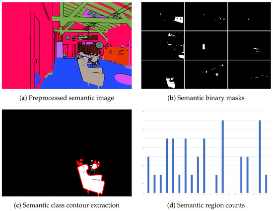 - For each frame, the semantic image is preprocessed using the method described in Section 3.1.1, as shown in Figure 6a.