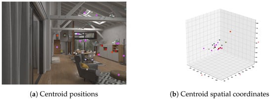 According to the aligned images, this paper calculates the spatial coordinates of all contour centroids as an approximation of the objects’ positions in space. Figure 8 illustrates the spatial coordinates of centroids extracted in the previous section.