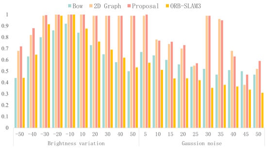 Next, the effect of adding noise on algorithm performance was analyzed. Compared with the algorithm based on the Bag-of-Words model, including ORB-SLAM3 and our trained Bag-of-Words model, the proposed algorithm achieved a superior performance in most cases, although the proposed algorithm’s scores fluctuated more due to the insufficient training of the neural network, causing the semantic segmentation results to be sensitive to noise interference. This issue can be addressed by further training the neural network. Compared with the 2D image-based graph matching algorithm, the proposed algorithm achieved an equal or slightly better performance.