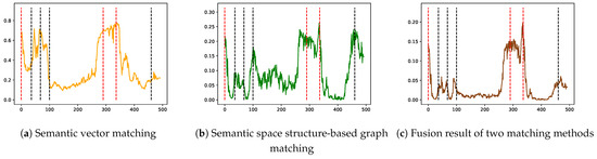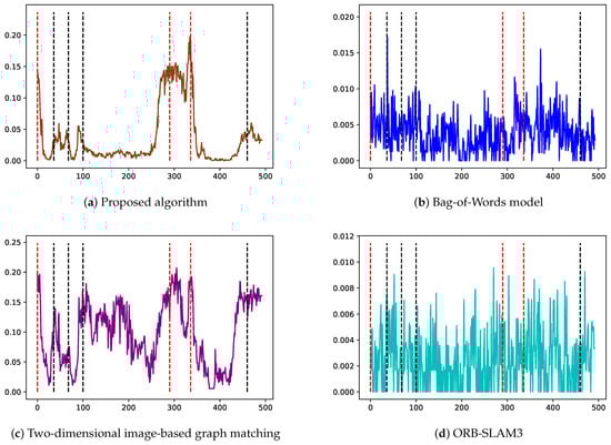 Figure 13 displays the similarity change curves for each frame using four different methods. The x-axis represents the frame number, while the y-axis represents the similarity score. The red dashed lines indicate the positions that correspond to three different shooting angles (Figure 11b–d); the black dashed lines indicate the positions that correspond to four scenarios that are prone to false positives (Figure 12a–d). A robust loop closure detection should exhibit high scores near the red dashed lines and significant differentiation from other positions, while scores near the black dashed lines should be as low as possible, with scores elsewhere remaining close to 0.
