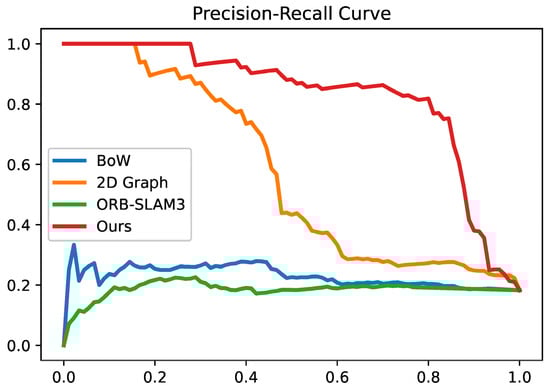To evaluate the performance of each algorithm, precision–recall curves were plotted, as shown in Figure 14. Precision–recall curves are a common method for evaluating loop closure detection performance, exhibiting the relationship between precision and recall under different threshold settings. Precision represents the proportion of all detected loops that are true positives, while recall represents the proportion of all true loops that are detected. When analyzing precision–recall curves, the focus is usually on two factors: the extent to which the curve shifts towards the upper-right corner and the recall value corresponding to 100% precision. The closer the curve is to the upper-right corner, the higher the precision at the same recall level, or the higher the recall at the same precision level. A higher recall value at 100% precision indicates that the algorithm can detect more true loops without false detections.