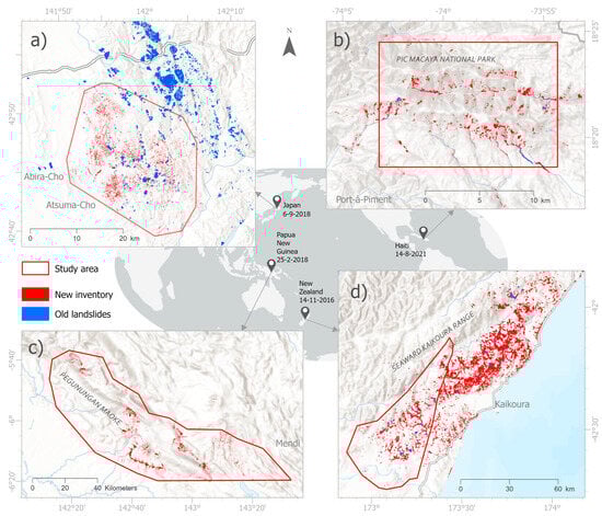 Distribution of landslides recorded in the landslide inventories used as case studies in (a) Japan, (b) Haiti, (c) Papua New Guinea, and (d) New Zealand, and study areas implemented in this study. The distribution of coseismic (old and new) landslides based on available landslide inventory data is indicated.