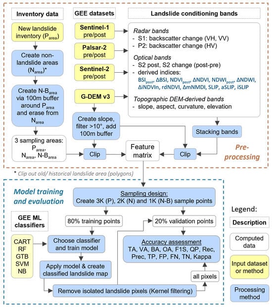One prominent and freely available example of a cloud-based processing environment is Google Earth Engine (GEE), which allows users to visualize and process multi-petabyte archives of satellite imagery and geospatial datasets with planetary-scale analysis capabilities. GEE offers support tools to analyze and monitor environmental properties on a large scale [53]. A rise in published journal articles related to GEE over the last three years highlights the increased popularity of GEE, with L8 and S2 being the most widely used earth observation satellite sensors, and articles based on Random Forest and water resources most often reported [54]. Several existing landslide detection methods have been implemented in GEE [19,29,39,42,43,44,45,46,55]. However, only Handwerger et al. [19] provide a shared GEE script that allows replication and potential adjustment of the script to other landslide events. GEE offers not only the opportunity to implement and compare existing landslide detection methods but also to apply and compare different ML classifiers for advanced landslide detection, an aspect that to our knowledge has not yet been addressed in the literature. In addition to detection, a few other landslide-related studies implemented in GEE are worth noting, focusing on landslide deformation tracking [56], recovery [37], or susceptibility [57,58,59,60]. Khan, et al. [61] provide a comprehensive comparison of all ML classifiers available in GEE (except Gradient Tree Boost (GTB)). The only published research using ML algorithms in GEE for landslide detection that we are aware of is based on RGB satellite imagery extracted from Google Earth Pro [49,50].