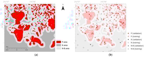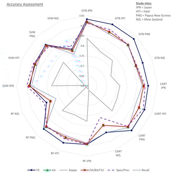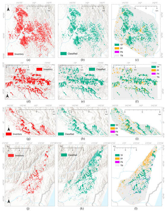 Validating the accuracy of landslide detection approaches is usually based on available ground truthing, in the form of either point samples of confirmed landslide locations or polygons representing their spatial boundaries. The latter is either captured in the field or created via digitization from very high-resolution (VHR) aerial or satellite RGB imagery on which the boundaries of landslides are clearly visible. Ground truthing-based accuracies assessment utilizes confusion matrix-derived metrics that can be categorized into three groups: (a) metrics on the positive class: recall, precision (Prec), F1 score (F1S), false positive rate (FPR), commission error (CE); (b) metrics on the negative class: specificity (Spec), negative predictive values (NPV), omission error (OE); and (c) metrics on both classes for imbalanced data: overall accuracy (OA), balanced error (BE), balanced accuracy (BA), quality percentage (QP), and kappa coefficient [38,39,40].