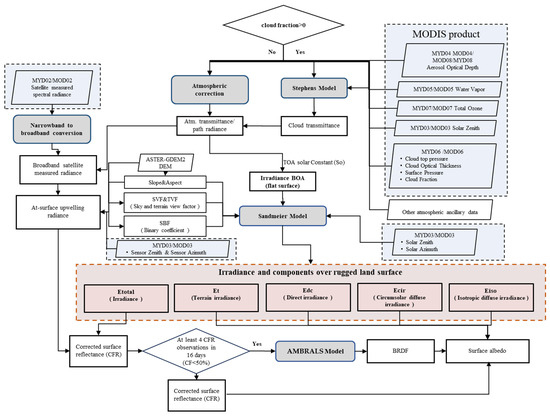 Schematic diagram of the workflow for the retrieval of the surface albedo in rugged terrain.