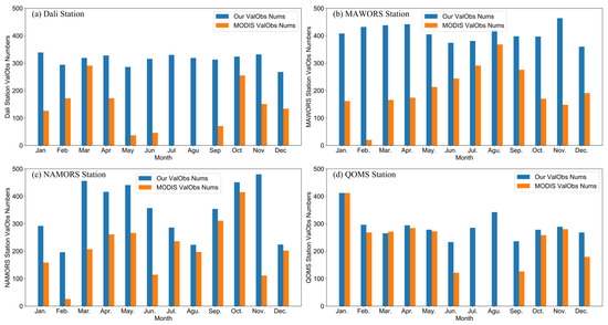 Comparison of the monthly distribution of the sum of the number of valid daily surface reflectance observations (ValObs) between our method and MODIS MCD43A2 that can be used for successful retrieval of daily surface albedo within each 16-day moving window at the four stations on the Tibetan Plateau in 2018: (a) Dali Station, (b) MAWORS Station, (c) NAMORS Station, and (d) QOMS Station.