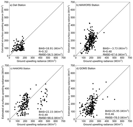 Our method relies on the estimation of the at-surface upwelling radiance under all sky conditions, which requires the estimation of cloud reflectance and transmittance, in addition to atmospheric absorption and scattering and to terrain irradiance (see Section 3.2). We compared our estimation of at-surface upwelling radiance with a set of ground observations at the four stations on the Tibetan Plateau in 2018. We used time averaged observations of a temporal interval of 30 min (QOMS, MAWORS, and NAMORS) or 1 h (Dali). We applied four error metrics—BIAS, MAPE, RMSE, and R—calculated using Equations (30)–(33). Better estimates of the at-surface upwelling radiance were obtained for MAWORS, NAMORS, and QOMS than for Dali when the cloud fraction (CF) of the pixel at the ground site measured by MOD06/MYD06 was less than 50% (Figure 4).