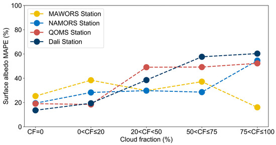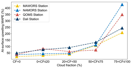 The MAPE for at-surface upwelling radiance estimates at different cloud fractions at Dali, MAWORS, NAMORS, and QOMS stations on the Tibetan Plateau in 2018.