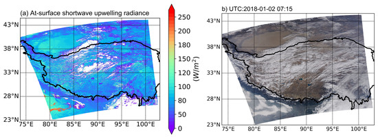 (a) The estimates of instantaneous at-surface upwelling radiance of the Tibetan Plateau (MYD Swath: UTC 2018-01-02-0715) and (b) MODIS true color composite images of bands 4, 3, and 1 at the same time.