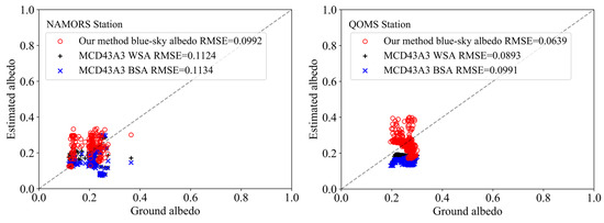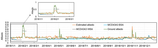Currently, satellite data offer a practical technique to estimate albedo at larger scales, and numerous algorithms and products on surface albedo have been developed over several decades. Since the launch of the Terra (1999) and Aqua (2002) satellites carrying the Moderate Resolution Imaging Spectroradiometer (MODIS), the estimation of land–surface albedo using remote sensing data has advanced significantly [9]. The MODIS retrieval system of the MCD43 product generates multiple BRDF data products [10]. The most accurate and reliable retrieval description of the BRDF is obtained by fitting the Ross Thick-Li Sparse (RTLSR) BRDF model to available cloud-free observations within each 16 day window (referred to as “full model inversion”).
