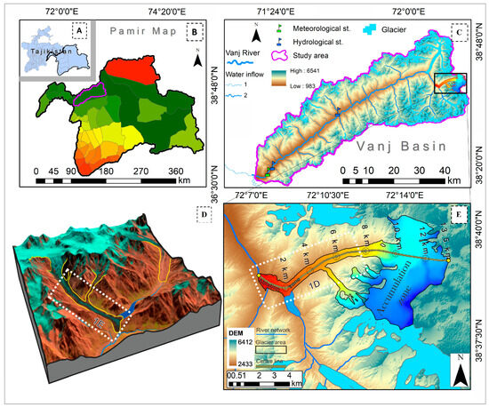 (A,B) The location of Pamir region in the map of Tajikistan (solid black line in figure (A)), (C) Vanj River Basin with Medvezhiy glacier (inset), (D) 3D Medvezhiy glacier model, and (E) glacier outlines and water inflow (manually digitized from Landsat image, 1973) and DEM.