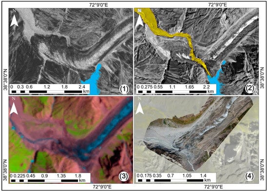 The role of glaciers in high mountain regions are vital for mankind and provide a sources for drinking water, irrigation, and energy generation (hydrostations), but they also pose occasional hazards such as glacial lake outburst floods (GLOFs) and ice avalanches, causing human casualties and economic losses in downstream areas [1,2,3]. Such types of glaciers are absent in flat and relatively low plateaus such as Antarctica and the Alps [4] but are concentrated in regions like the Alaskan–Canadian Arctic, Svalbard, and the Pamir–Karakoram Plateau [4,5]. A thorough study of the dynamics and behavior of surging glaciers, particularly during their surge stage, remains a rare occurrence in scientific research [6]. In many cases, surging glaciers completely cover valleys, forming pressure lakes behind ice dams and reaching tens and hundreds of meters in height, and their eventual rupture causes floods, which may take on a destructive nature [7]. Traditional markers like looped moraines or terminus shift [8] and current elevation changes [9,10] are used to identify surge-type glaciers. At the same time, the occurrence of glacier surging can pose significant risks to areas downstream, leading to events like glacial lake outburst floods (GLOFs), glacial meltwater debris flows, and glacier collapses [11,12,13], all stemming from natural disaster events. The constant monitoring of surging glaciers with aerial photography and satellite imagery is required to avoid dangerous consequences and achieve their possible prevention. Consequently, understanding the dynamics of surging glaciers can aid in forecasting the behavior of glaciers and the emergence of hazards in advance.