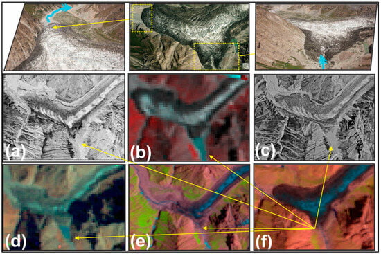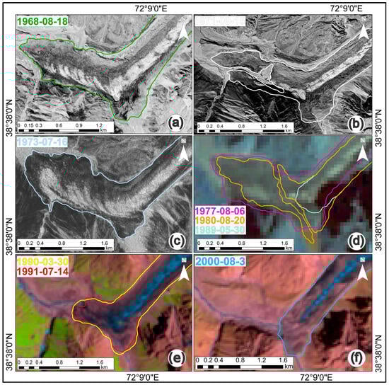 Comparing the progression and regression of Medvezhiy glacier before and after, using (a) Corona, (b–d) Hexagon, and (e,f) Landsat data: The lines depict the initial position of the glacier terminus in early images and its position in the latest images.