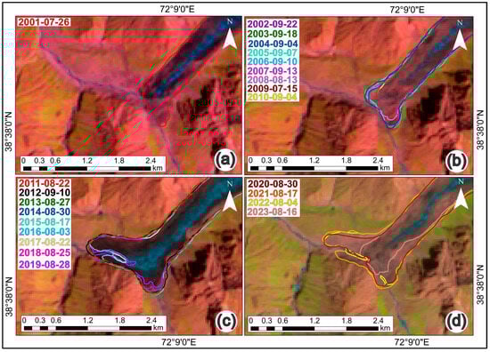 Comparing the progression and regression of Medvezhiy glacier before and after, utilizing Landsat data: Subfigures present the glacier’s terminus positions in four intervals: 2001 (a), 2002–2010 (b), 2011–2019 (c), and 2020–2023 (d). The lines illustrate the initial position of the glacier terminus in early images and its position in the latest images.